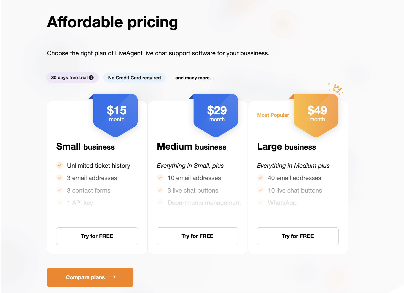 Live chat has three paid plans named Ticket, Ticket+chat & All-inclusive which is the most popular plan for live chat solutions.