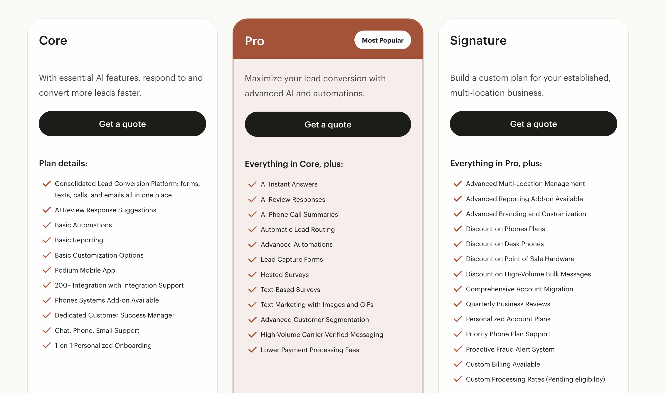 Podium doesn’t offer you fixed-priced plans, the pricing depends on how you customize your plans. But they don’t charge too much as they have mentioned in their pricing section.