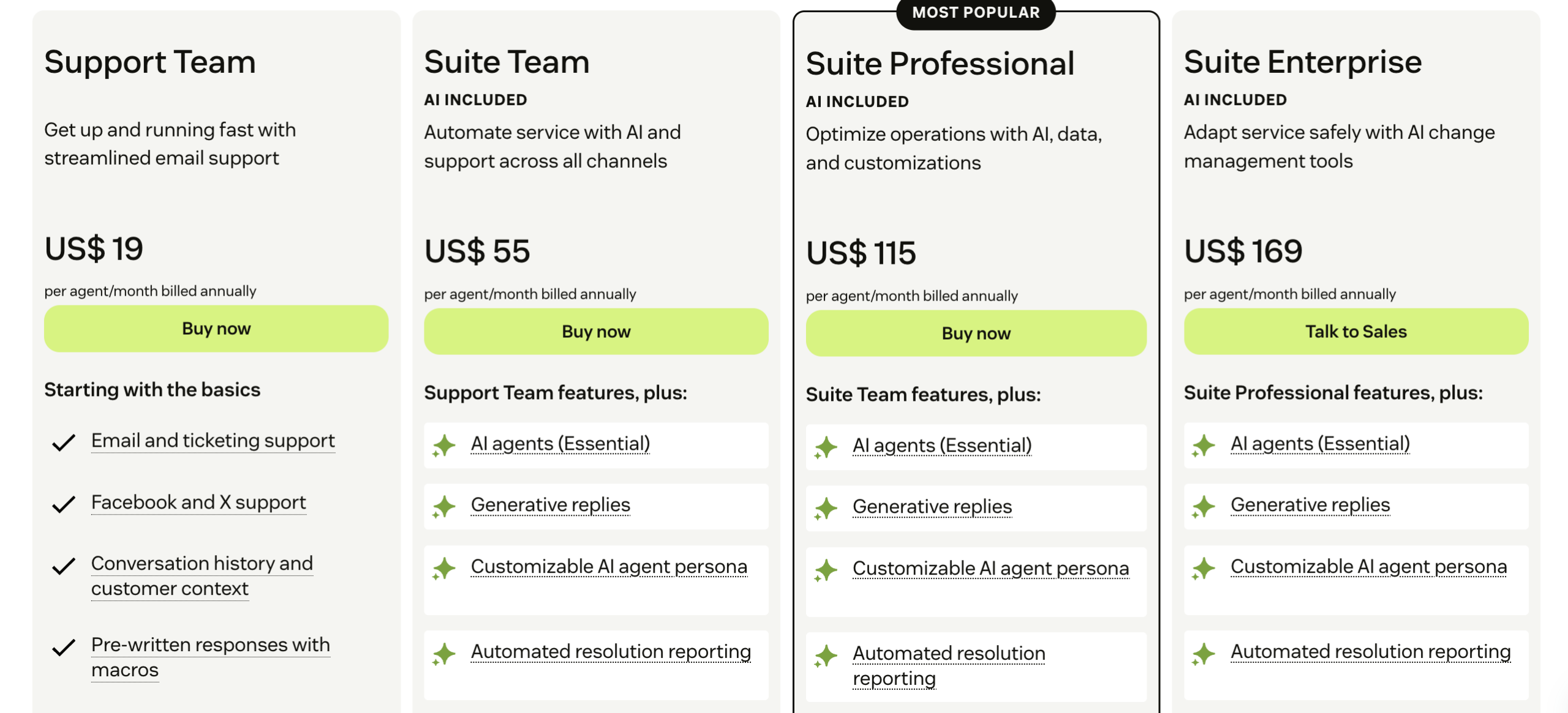 Zendesk Pricing has various types of plans for Foundational Support, Sales, and the Zendesk suite which is their flagship plan.