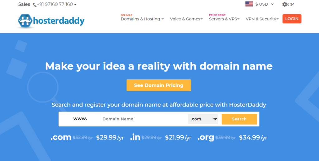 HosterDaddy lets you register your favorite domain name at the most affordable and lowest prices with full security and safety. It offers the domain names .com at $29.99 per year, .net at $29.99 per year, .co.in at $21.99, .in at $21.99, .org at $34.99 per year and more.