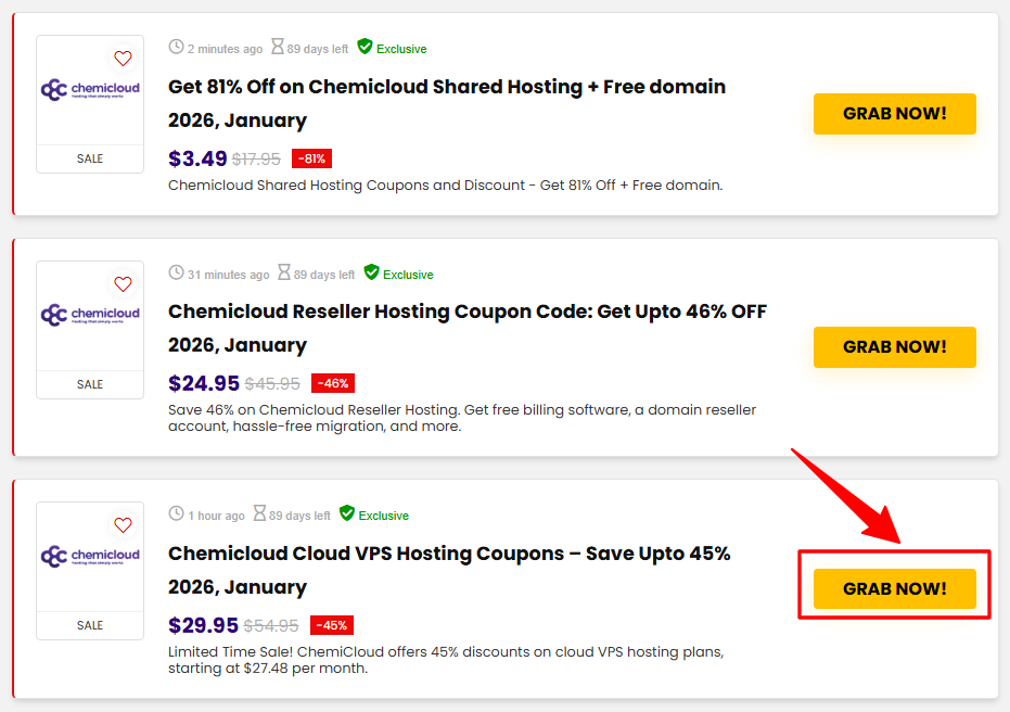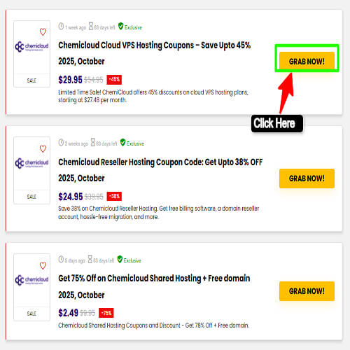 The Chemicloud Coupon Codes and Discount Offers are 100% Verified and Valid as well. On Clicking the GrabNow Option >> You are re-directed to the official website of Chemicloud, and the Coupon price is already subtracted from the web Hosting price.
