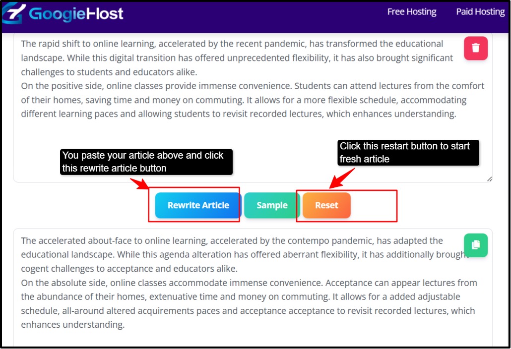 GoogieHost's Article Rewriter is an online paraphrase tool that rewords sentences, replaces context-aware synonyms, and restructures phrases to ensure the final material flows naturally and passes authenticity checks—all while maintaining the essential idea.