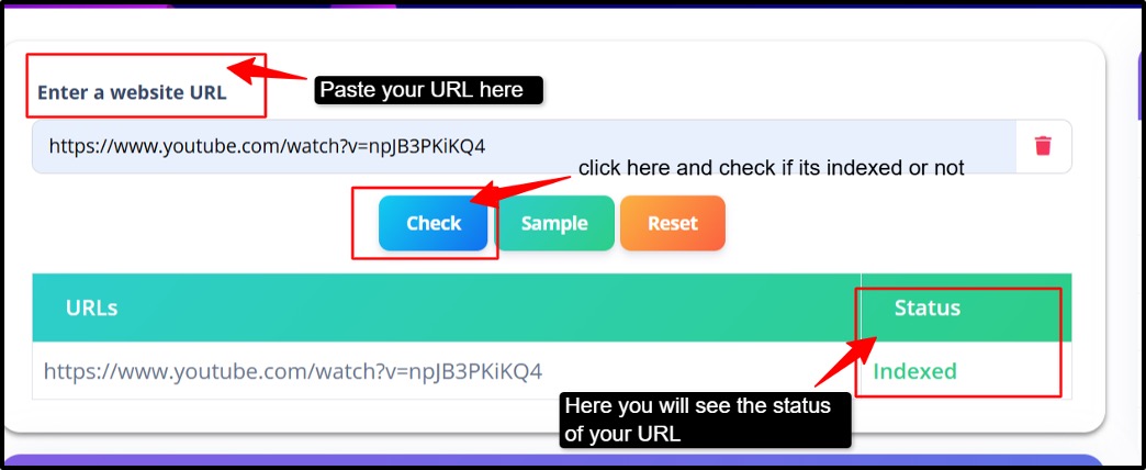 Step 3: Start the checking process. Click on the “Check Index” or similar button. Then this tool will start scanning your URLs as it connects with Google data to verify if your page is indexed or not.