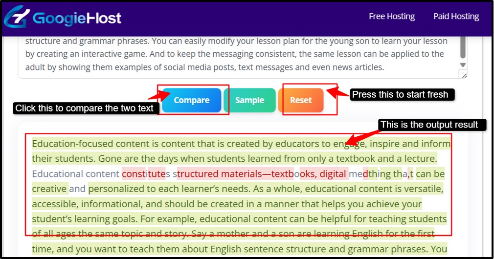 GoogieHost’s Text to Compare tool keeps things simple and practical with its clean two-window layout, where you can place both texts side by side and instantly spot the differences. With many options like Sample for quick testing and Reset to start fresh, it is designed for smooth, no-hassle use. Being a completely free, browser-based tool, it works instantly without downloads and quickly highlights changes.