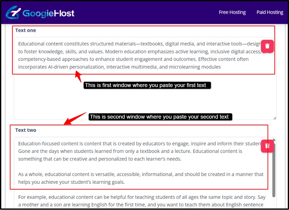 - GoogieHost’s Text to Compare stands out for its simple, focused interface that removes all unnecessary clutter and keeps the experience straightforward. You don’t need any technical knowledge to use it, just paste your text into the two boxes, and the tool does the rest. This makes it perfect for both beginners and regular users who want a quick, no-distraction workflow without dealing with complex settings or features.