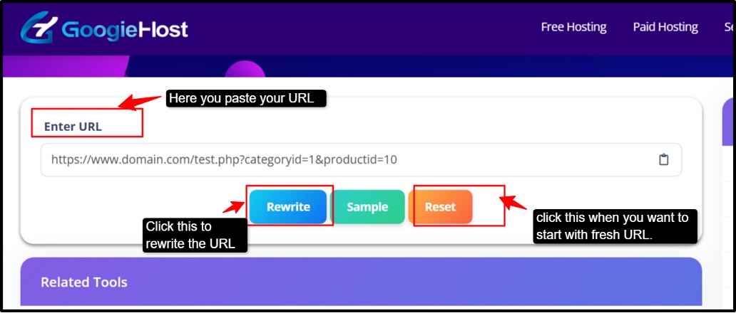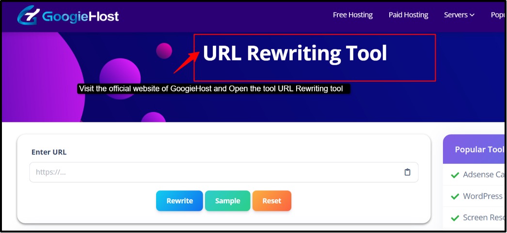 Step 1. Open the tool page: Start by visiting the URL rewriting tool on GoogieHost. You will see a simple interface, nothing confusing.