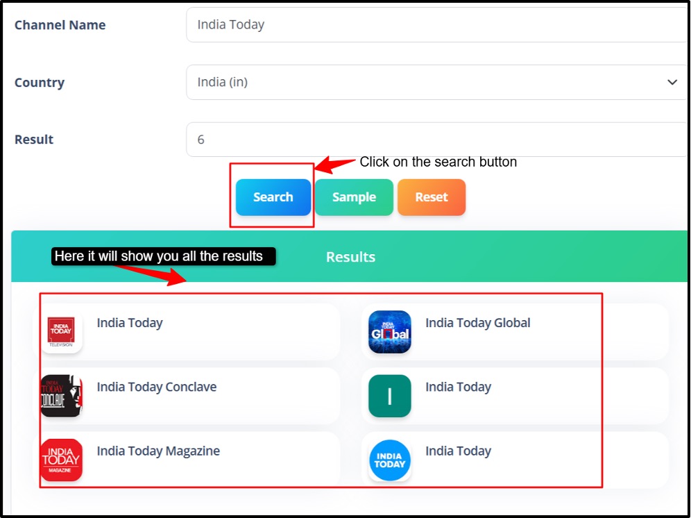 Step 5: Click "Search" >> Hit the "Search" button >> Results for channels that correspond to your query will be retrieved promptly by the tool.