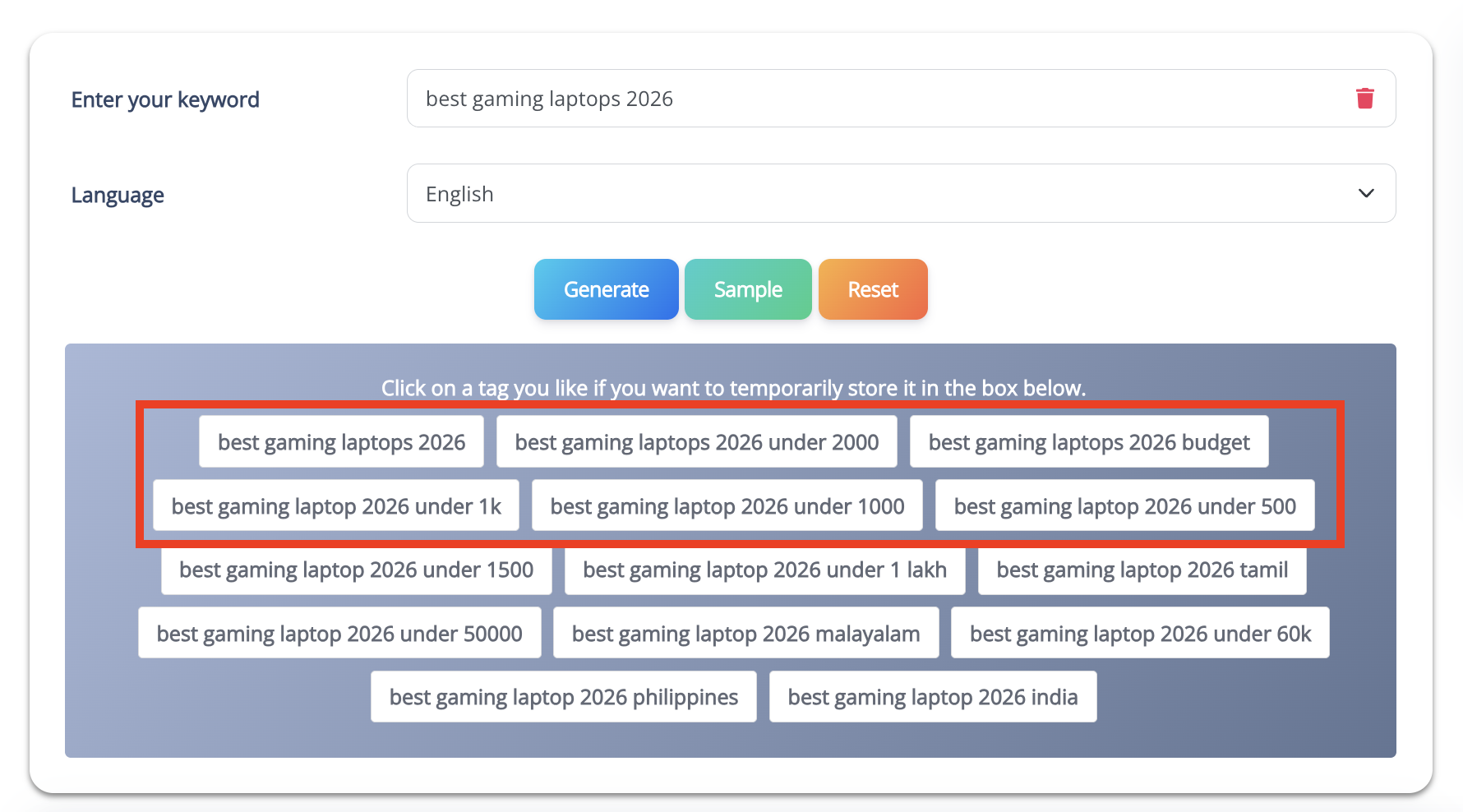 Note: Be specific with your keyword, as this helps the tool generate more accurate and relevant tag suggestions. |
