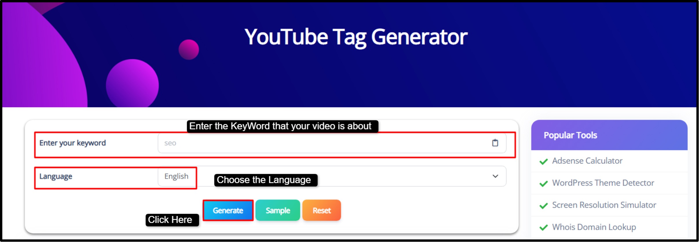 Ans. Simply enter your main keyword or video topic, choose your preferred language, and click Generate. The tool instantly provides SEO-friendly tag suggestions. You can also use the Sample option for guidance or Reset to clear your input and start fresh.